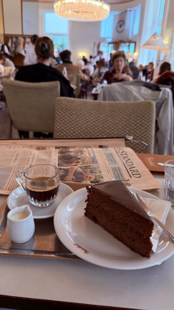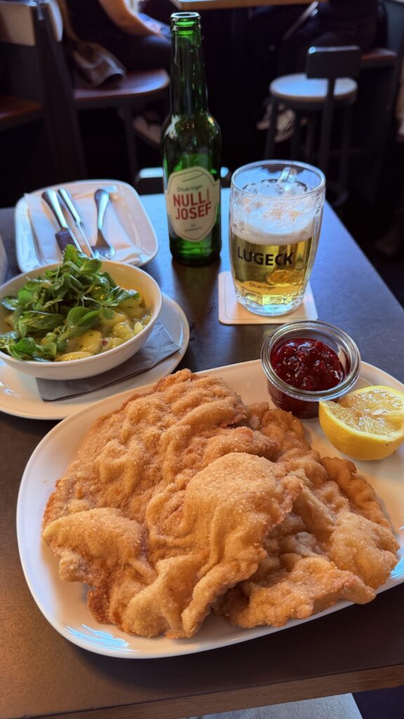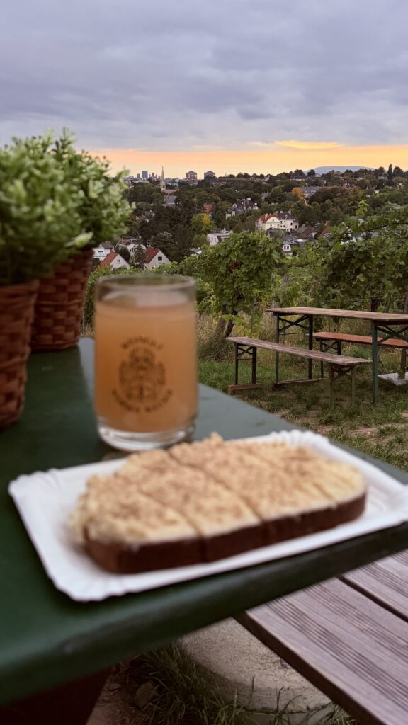 Am Ende tat ich es, rein in den Zug, acht Stunden nach Wien, eine erstaunlich schöne Fahrt im funktionierenden ICE mit Bordbistro, Beinfreiheit und wenig Verspätung. In Wien checkte ich im Hostel ein, traf Felix, einen alten Bekannten von den Kapverden, auf ein Würstchen und hinterher noch ein paar Gläser Wein. Am nächsten Tag schaute ich mir die Donauinsel an, spazierte am Prater, zündete eine Kerze im Stephansdom an, aß ein original Wiener Schnitzel vom Kalb, trank eine Melange im Kaffeehaus und las Zeitung dazu, aß eine Sachertorte und fuhr zum Sonnenuntergang noch rauf zu einer Heurigen, wo es Federweißen und ein leckeres Brot mit einem Kartoffel-Käse-Brotaufstrich gab. Perfekt.