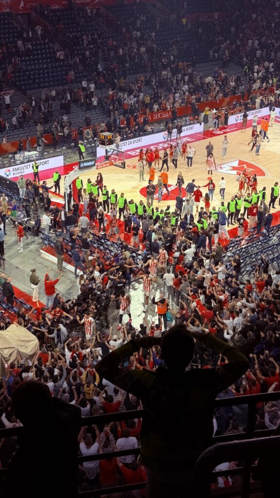 Irgendwo hinter der serbischen Grenze (es gab natürlich noch eine Passkontrolle) wechselte mein Nebensitzer in Luc aus Groningen. Wir verstanden uns auf Anhieb und verabredeten uns noch am gleichen Abend auf was zu essen und ein paar Bier und am nächsten Tag zu einem Basketballspiel von Roter Stern. Lucs Idee und warum nicht? Es war brisant und spannend und am Ende gewannen wir.